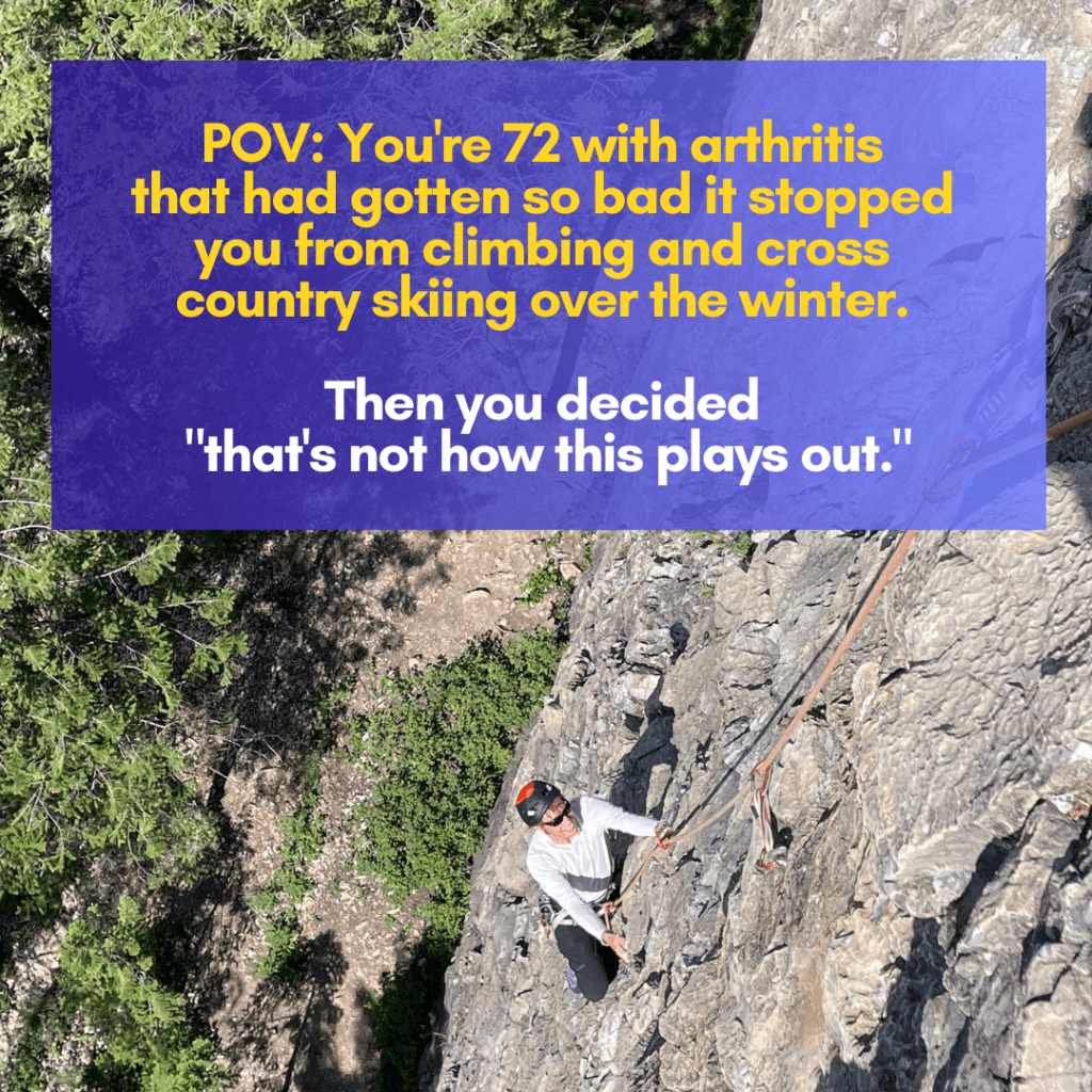 Bruce has arthritis in multiple joints (shoulders, knees, and wrists). The pain and limitation had increased to the point where he was no longer cross country skiing, going to the climbing gym, or training at @goldensgym247.