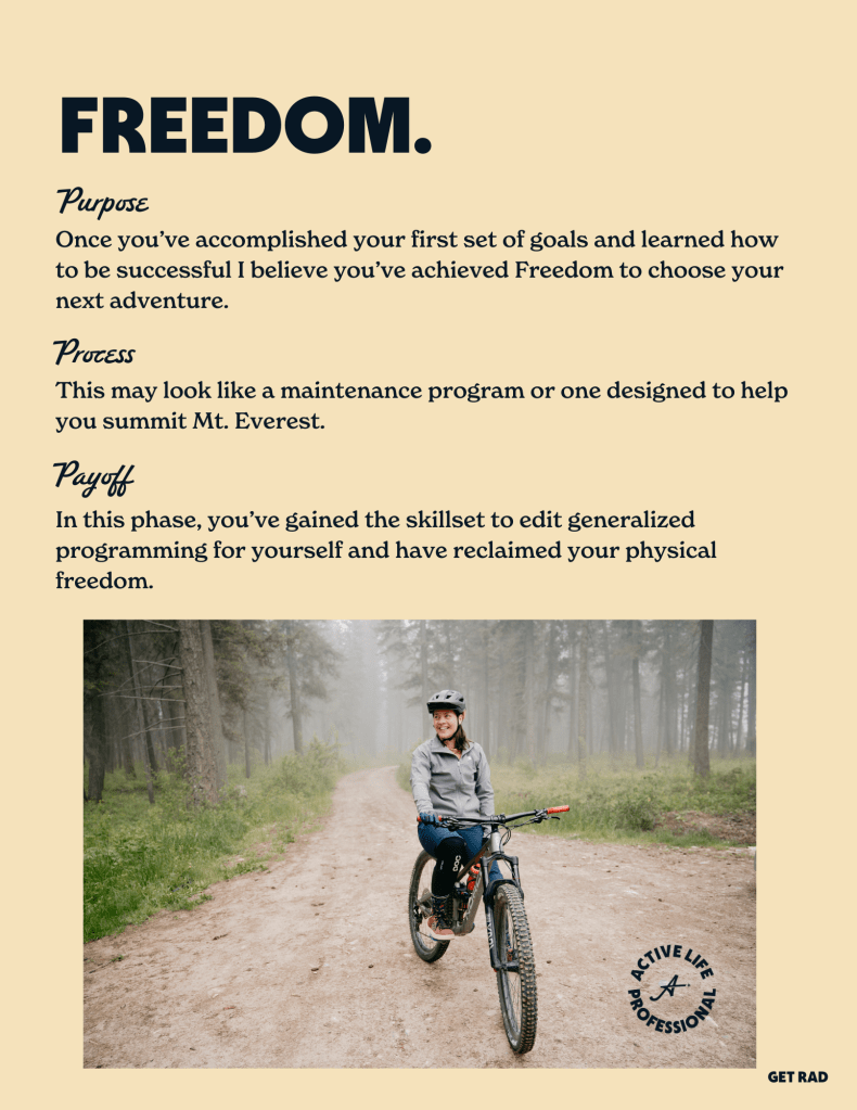 I am an Active Life Professional. My clients receive a personal development program that provides education, exercise, and mentorship to empower a life of freedom, without compromise.