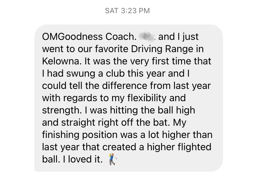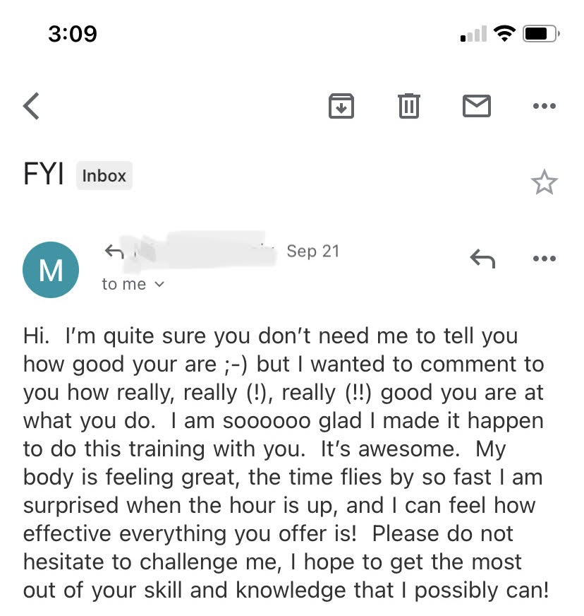 I need to see what shapes and positions their body is capable of making before asking them to add load or intensity! Doing a 10-minute gentle assessment at the start of our session starts to give me a good idea of how well a person moves, and if I need to modify other movements we might later that day or in future sessions. For example, we will check your ankles. If they don’t have a lot of flexibility, this means that your ability to perform a squat may be impacted, because a deep squat requires a good amount of ankle flexibility. So when I check out how you squat later that day, I might give you a few options for us to work around the flexibility of your ankles in the short term, and will create a plan in the mid term in order for you to get your ankles more flexible! We don’t ignore limitations. We keep you safe and comfortable in the meantime, and then do the work of improving on those limitations so that they get resolved!