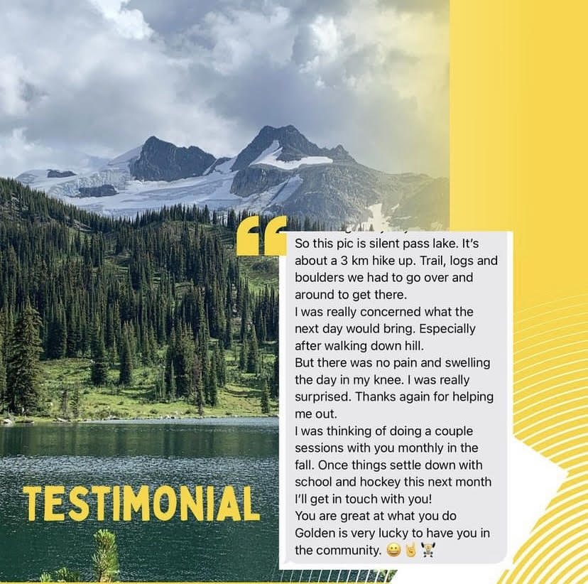 “Sonya and I had 3 great days at Lake O’Hara and I pulled off my biggest hike since my knee replacement. 5.6 miles and over a 1000 ft elevation gain! You gave me the tools and I pulled them out and kicked some ass! It was tough going but dammit I made it!! The hike was from Lake O’Hara lodge to Lake MacArthur which is the lake in the picture! Pretty happy 18 months post knee replacement!”
