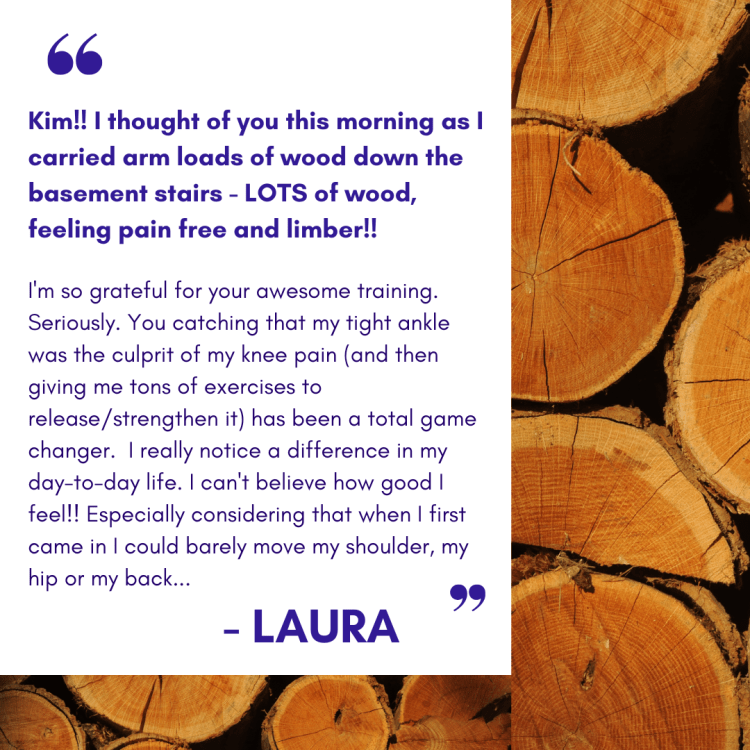 What if we find that the source of your knee pain after all wasn’t that you “have bad knees” but was being caused by limited ankles? This exact thing was what we discovered with Laura. See her testimonial below.