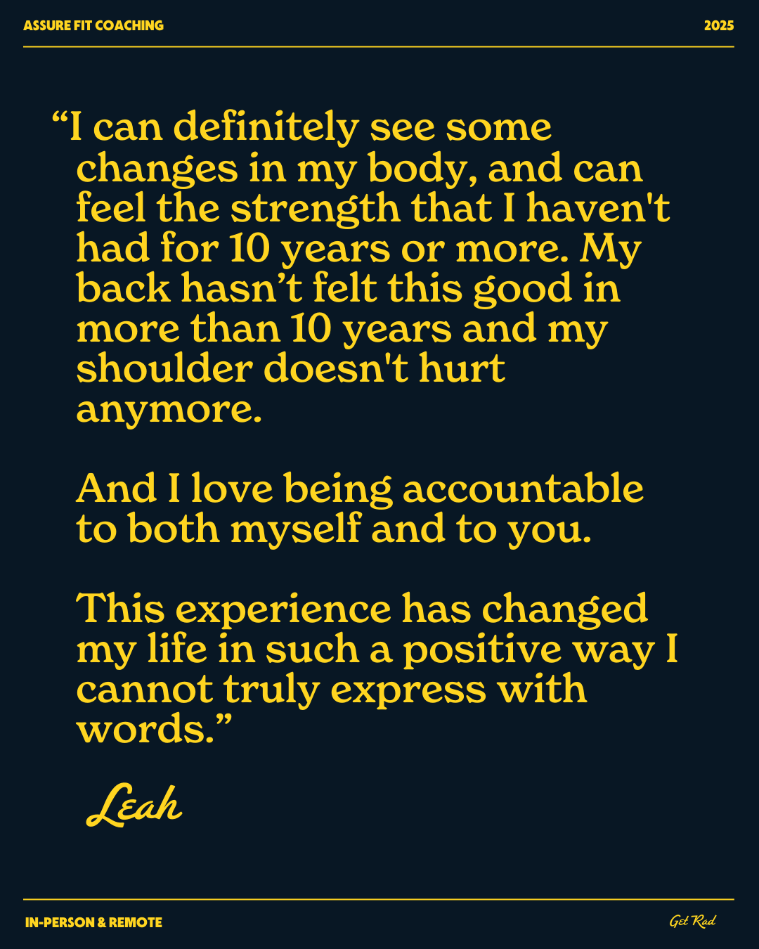- In person workouts provides accountability & support, and the opportunity for me to adapt the plan and provide exactly the right dose and type of work you need that day (meeting you where you’re at)
