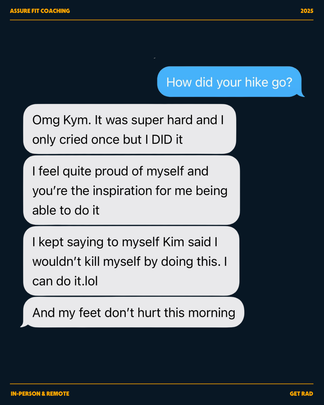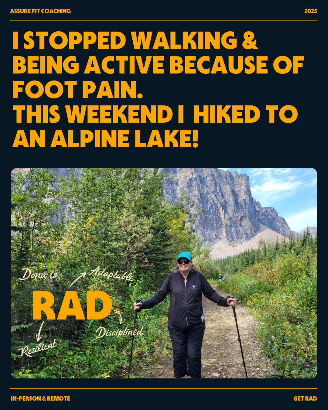 In 24 sessions, we increased her strength & aerobic fitness, improved her mobility, and worked on specific exercises for her feet. She worked on improving her nutrition, self talk, sleep, and stress management.