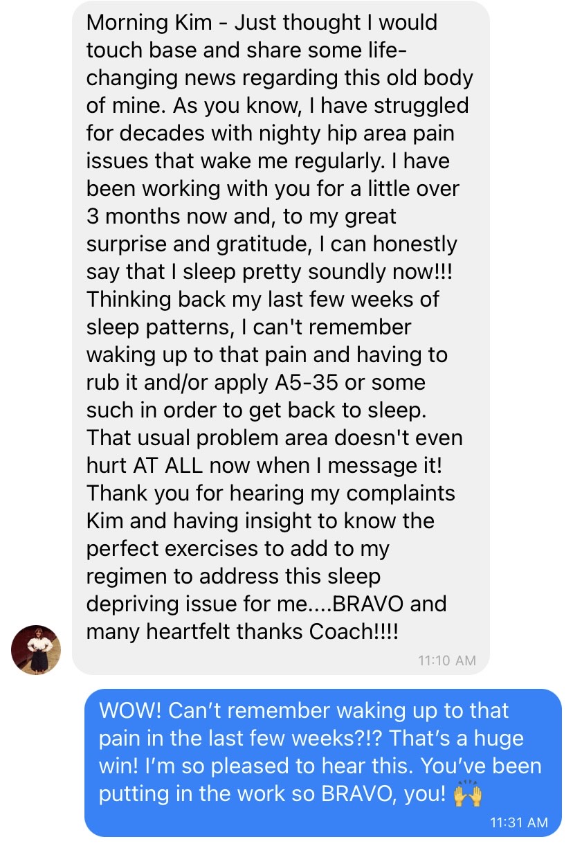 For someone who enjoys being active like me, it was frustrating having alignment issues and imbalances throughout my body. Kim worked thoroughly with me to assess not only the imbalances I knew I had, but those I was not fully aware of and created a plan that allowed me to build strength while gaining mobility and giving the attention needed to these areas. Now I am in a position to pursue my fitness goals because of the work we did together.