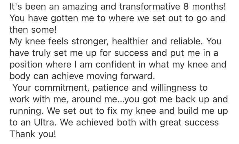“You gave me my freedom of movement (painfree!) back. I am so thankful. The ability to run, lift, bike, hike – everything again has been worth every penny, sweat drop and tear. Thank you for the last 8 months of hard work and BIG calves 🙂
