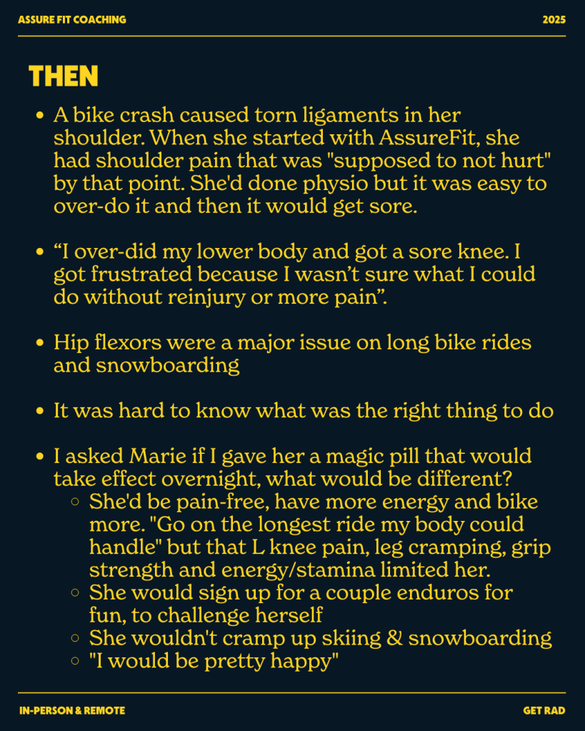 “Kim at Assure Fit did a great job tailoring a program to my fitness needs and wants. I started out with a month of personal training where they did a thorough assessment of my fitness and oriented me to gym equipment. They then designed a program to help me maintain bone mass and get fit for skiing, mountain biking and hiking. Over time my strength has improved and I have not been plagued by aches and pains. I have moved out of Golden but still use them as a coach from afar. They keep in touch through regular phone calls and the TruCoach app, modifying exercises as I progress, keeping me motivated. I have found Kim to be professional, knowledgeable and enthusiastic.”