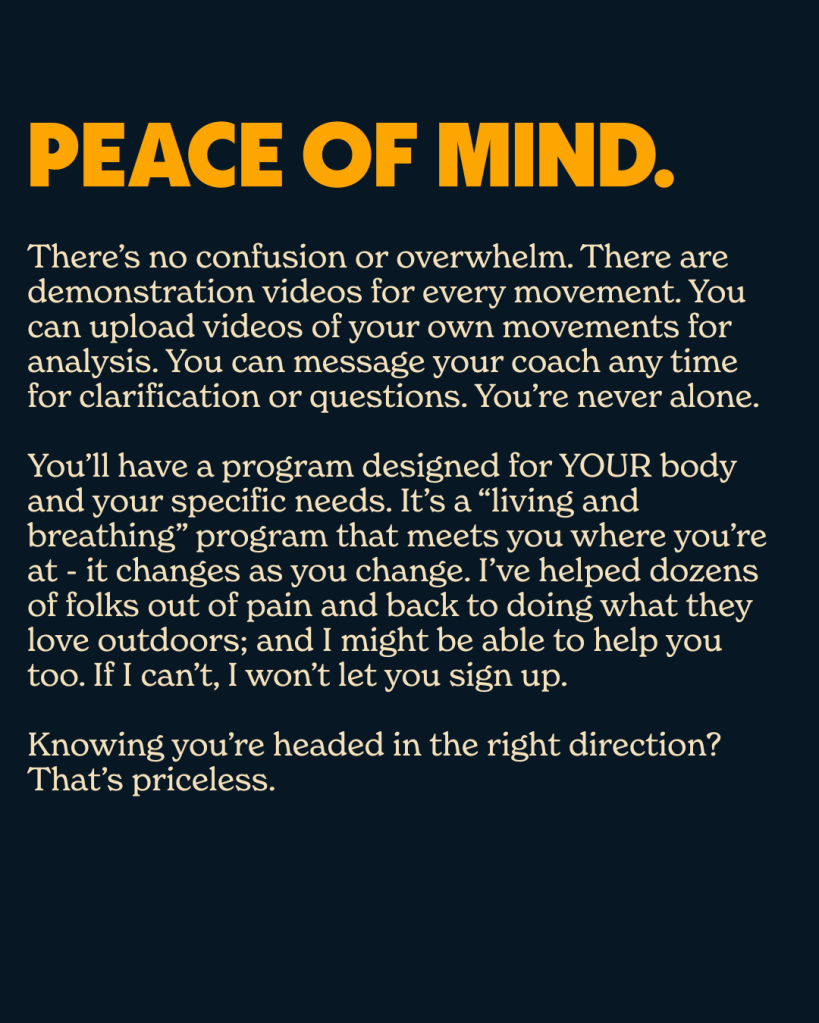 There’s no confusion or overwhelm. There are demonstration videos for every movement. You can upload videos of your own movements for analysis. You can message your coach any time for clarification or questions.
